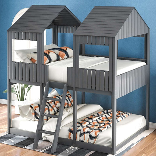 Full Over Full Wood Bunk Bed With Roof, Window, Guardrail, Ladder