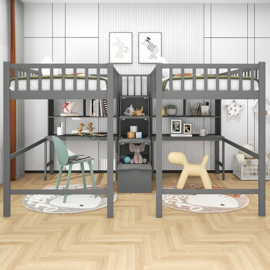 Gray Twin Loft Bed with 2 Built-in Desks and Shelves, and Storage Staircase
