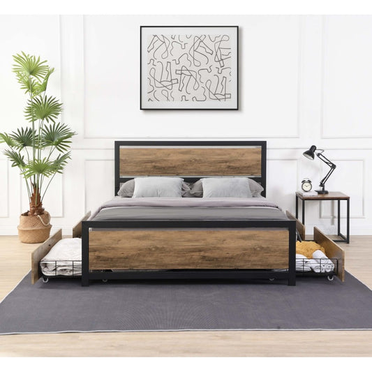Full Size Industrial Wood and Metal Bed Frame with 4 Storage Drawers