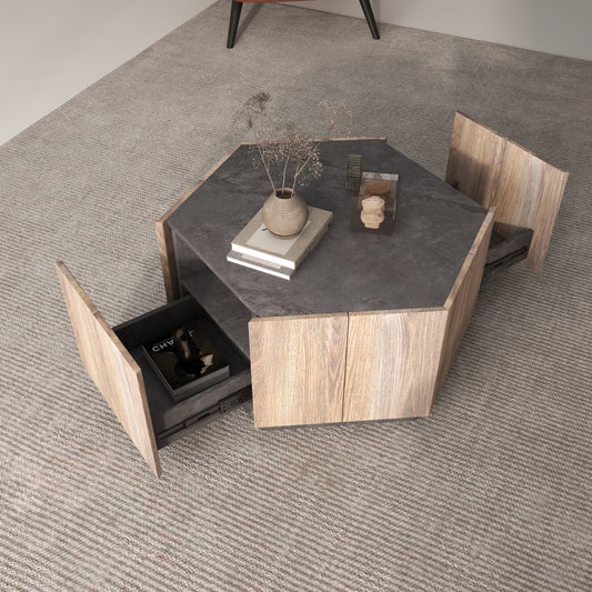 Sechseckiger Couchtisch im ländlichen Stil + 2 Schubladen, Grauzement + Mahagoni